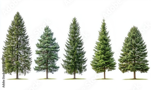 Collection of large pine trees isolated on white background. AI generated illustration.