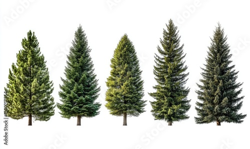 Collection of large pine trees isolated on white background. AI generated illustration.