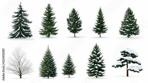 Collection of snow-covered fir trees, isolated on white, for winter holiday design