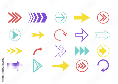 Color arrows set. Arrows direction symbols. Icons of up, down, right, next, cursor, back, left, circle, rewind, repeat, forward, pointer for web navigation. Simple digital shapes and lines. Vector