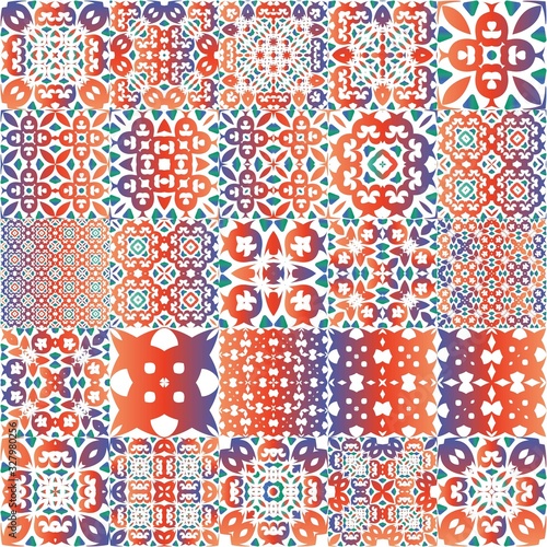 Colored antique patterns in ceramic ethnic tiles.