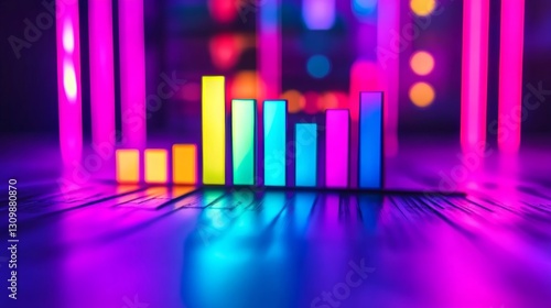Colorful 3D bar chart graphic reflecting on shiny neon lit floor