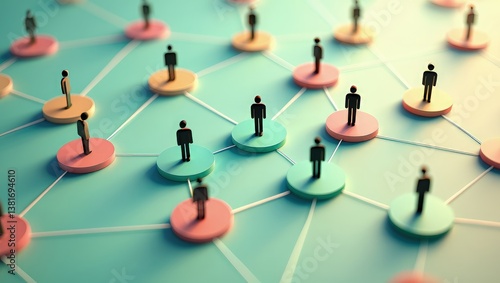 Colorful 3D people icons interconnected by lines on teal background. Social media connections shown. Modern tech concept. Network effect highlighted. Collaboration, team work exemplified. Diverse