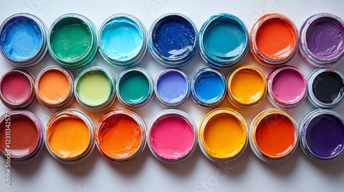 Colorful Array: Paint Tin Pattern Display with Vibrant Tins, Creative Arrangement of Small Paint Cans