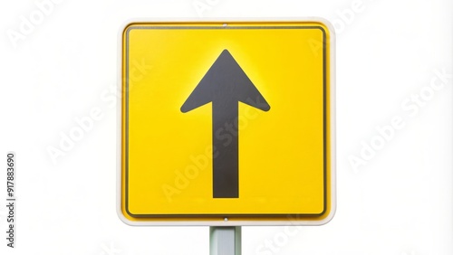 Colorful arrow sign with a bright yellow sticker in the center, pointing upwards, isolated on a white background, conveying positivity and direction.