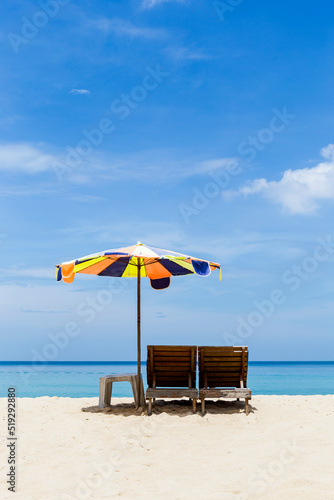 Colorful beach umbrella and wooden chair on beautiful beach, tropical summer background, holiday and vacation destination, beach in south of Thailand