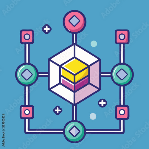 Colorful Blockchain Network Vector Illustration, Vector illustration of a blockchain network with interconnected colorful blocks, symbolizing secure digital transactions and data exchange.
