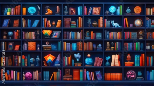 Colorful bookshelf filled with art books and decorative items.