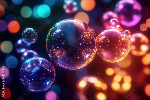 Colorful bubbles floating in a dreamy background, creating a magical and vibrant atmosphere filled with light and reflections.