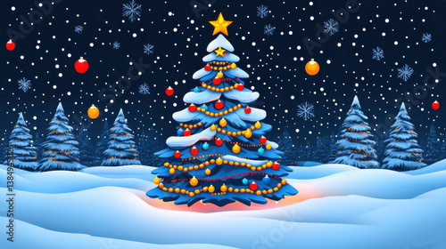 colorful Christmas tree adorned with ornaments and lights stands snowy landscape, surrounded by snowflakes and evergreen trees, evoking festive