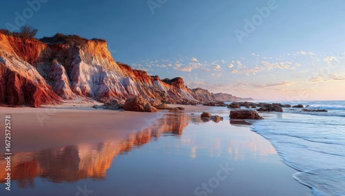 Colorful cliffs meet sandy beach. Calm water reflects sunrise