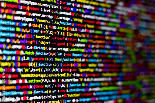 Colorful code background. compressed javascript code on computer screen. Software developer coding screen
