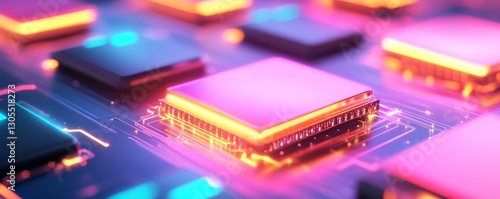 Colorful computer chips glowing in a dark setting.