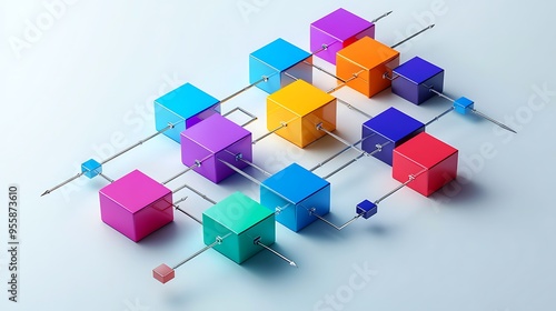 Colorful cubes connected with arrows, creating a dynamic network structure that symbolizes connectivity.