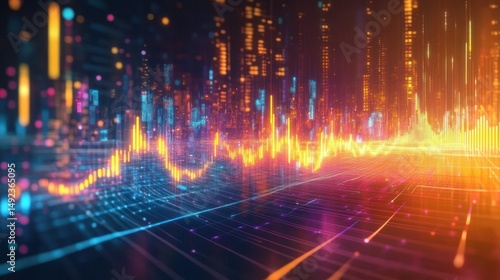 Colorful digital graph and data visualization with glowing lines and bars representing fluctuating information in a futuristic virtual environment