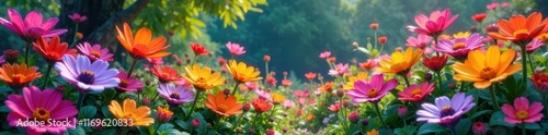 Colorful flowers blooming in a psychedelic garden, retro style, floral design, bohemian style