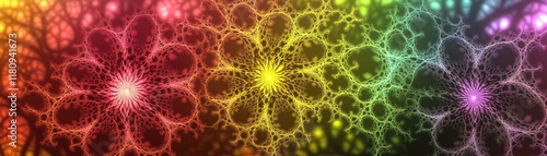 Colorful fractal flowers with intricate patterns and vibrant gradients.