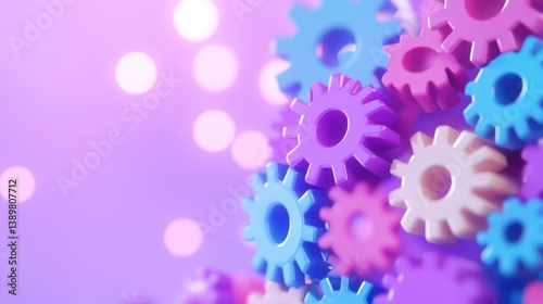 Colorful gears arranged dynamically with a soft, bokeh background, creating a visually appealing and modern design.