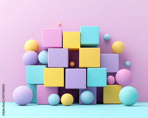 Colorful geometric blocks and spheres arranged against a pastel background, creating a playful and modern abstract display. dynamic dimensions depth angles