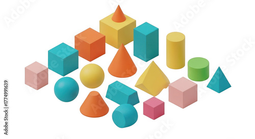 Colorful geometric shapes including cubes, cones, and pyramids isolated on transparent background