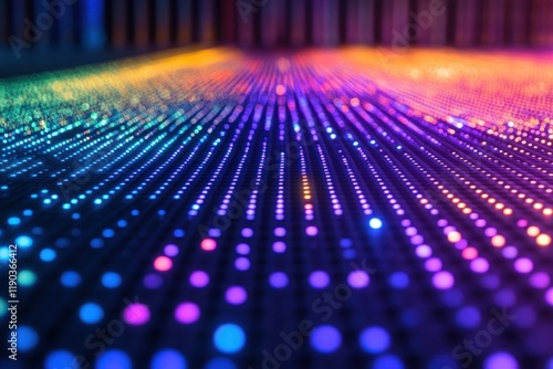 Colorful LED lights forming lines converging at a vanishing point.