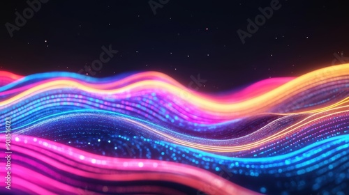 Colorful neon light waves flow fluidly across a dark background, creating an energetic and vibrant atmosphere