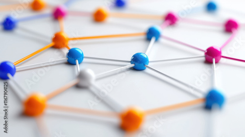 Colorful network connections with nodes and links representing data flow and relationships. This abstract image illustrates concept of machine learning and algorithms