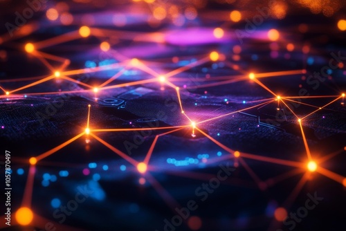 Colorful network graph, glowing nodes, abstract design, data visualization