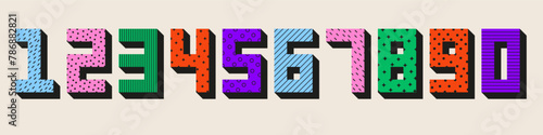 Colorful number set from 0 to 9. Geometric figures with texture pattern