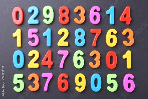 Colorful numbers on dark gray background, flat lay