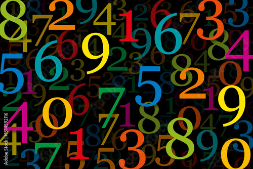 Colorful numerals, randomly distributed against black background. Dynamic pattern, composed of overlapping numbers from zero to nine. Visual effect and symbol for the playful handling of many numbers.