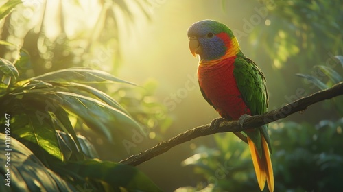 Colorful parrot perched on a branch in a lush, sunlit rainforest.