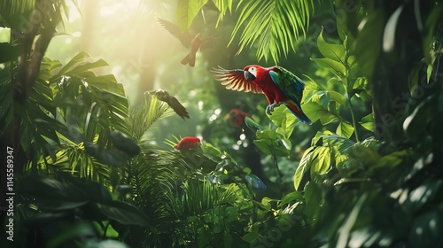 Colorful parrots flying through lush rainforest wildlife photography nature environment vibrant greenery