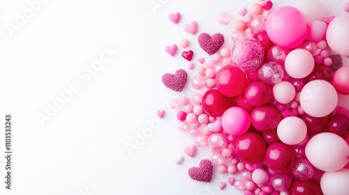 Colorful Pink and Red Decorative Balls and Hearts on White Background