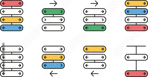 Colorful process flow diagrams representing different stages and sequences with arrows and rectangular shapes.