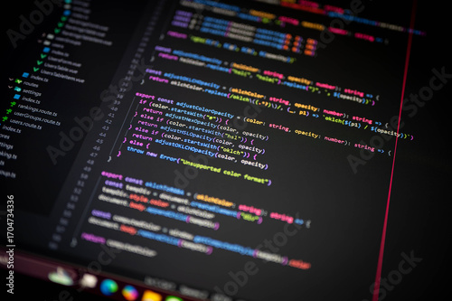 Colorful programming code on screen showing adjustColorOpacity, adjustHexOpacity, adjustHSLOpacity, and okLCH functions, symbolizing frontend development, UI design, and digital technology.