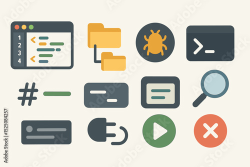 Colorful programming icons featuring code, bugs, and tools