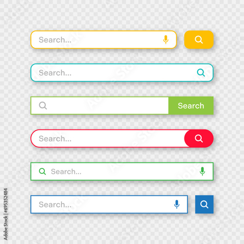 Colorful search bar templates. Internet browser engine with search box, address bar and text field. UI design, website interface element with web icons and push button. Vector illustration