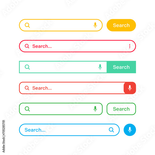 Colorful search bar templates. Internet browser engine with search box, address bar and text field. UI design, website interface element with web icons and push button. Vector illustration