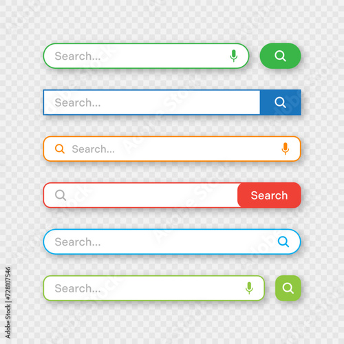 Colorful search bar templates. Internet browser engine with search box, address bar and text field. UI design, website interface element with web icons and push button. Vector illustration