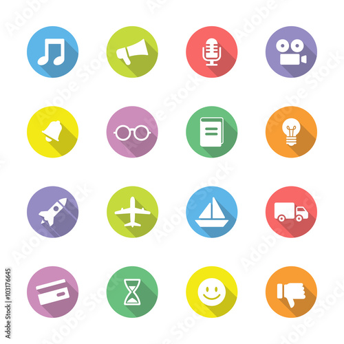Colorful simple flat icon set 5 on circle with long shadow for web design, user interface (UI), infographic and mobile application (apps)