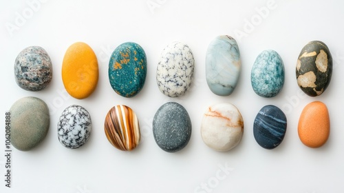 Colorful, smooth stones with various textures, arranged neatly on a white background
