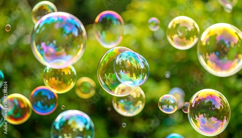 Colorful soap bubbles in green nature