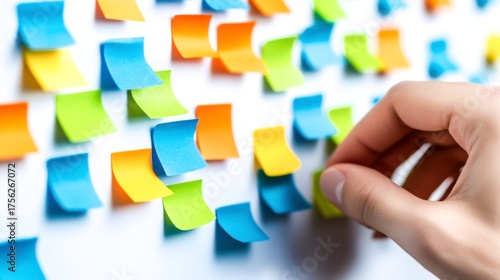 Colorful Sticky Notes on Wall with Hand Picking Note for Creative Ideas and Planning