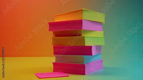 Colorful sticky notes stacked on table, gradient background, office supplies
