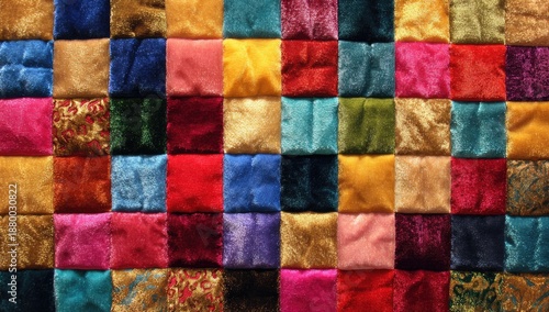 Colorful, textured fabric squares arranged in a grid pattern