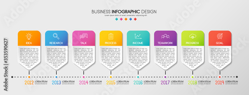 Colourful timeline infographic with 8 options. Vector