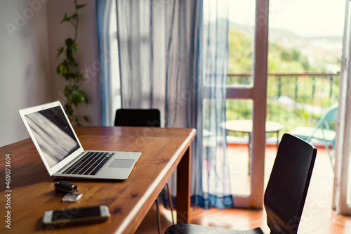 Comfort workplace. Laptop computer on wooden table.