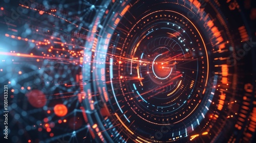 Complex circular interface visualizing data flow and processing, showcasing advanced technology and futuristic design with glowing lines and particles