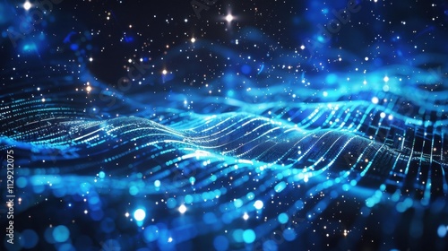 Complex data streams are visualized as a luminous blue wave, sparkling with countless data points, creating a dynamic representation of information flow in the digital realm